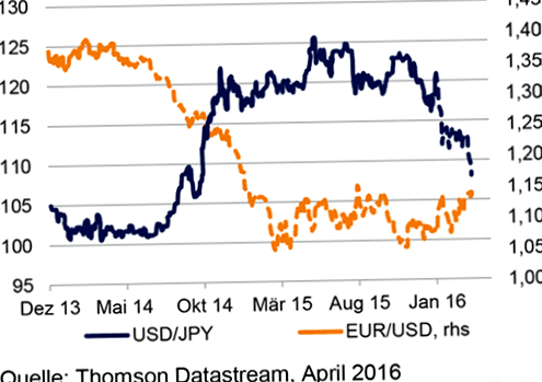 Figure 5: Euro (right scale) and yen (left scale) versus U.S. dollar (dashed lines represent the introduction of negative interest rates)