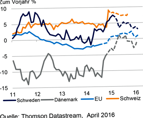 According to the intentions of the central banks, in some countries with negative interest rates more credits were created (see figure 4). However, the situation is somewhat more complex and must be seen in the context of the economic recovery of these countries. They also took other measures, such as quantitative easing, to expand lending volumes. In the euro area, lending to nonfinancial corporations has been rising slowly since the onset of the financial crisis. But tighter regulation (most notably, with asset quality reviews, the "stress tests" and higher Tier 1 capital requirements) led some analysts to believe that financial institutions will become less committed to credit creation. While there is much to be said for this argument, we tend to see valuable stimulus for traditional banks in some of the ECB's actions (particularly the targeted longer-term refinancing operations, GLRGs/TLTROs). We trust that the large cash buffers on corporate balance sheets will successfully offset some of the medium-term threats to credit creation in the region.