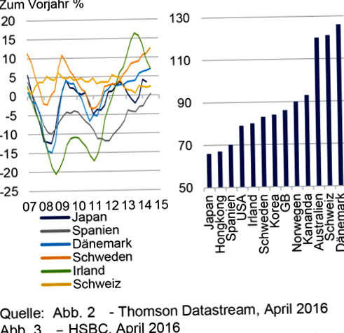 To alleviate some of the pressure, banks in some countries have increased (i.e., not reduced, as lower interest rates actually suggest) the cost of financing for households. In Switzerland, for example, risk premiums on mortgages widened after the introduction of negative interest rates (see Figure 1), which may have contributed to the slower growth in residential real estate prices (see Figure 2). Other countries that introduced negative interest rates, such as Sweden, have not yet experienced this phenomenon. In our opinion, higher borrowing costs despite lower capital costs are a clear sign that a negative interest rate environment has unintended consequences.