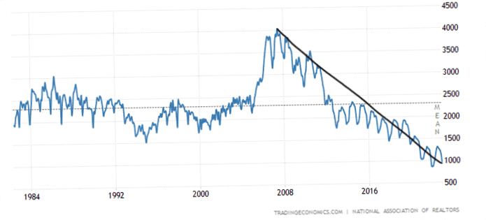 Unfortunately, we have a good shot at the next existing home sales report, which shows even lower inventory levels than the 970.000 level that we're dealing with today. This means that 2022 and 2023 are the only times in recent history that NAR active listing data have been below 1 million.