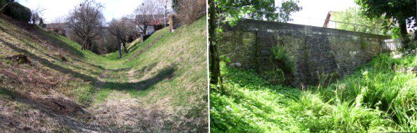 In its original form, the town moat was 5 m deep, 25 m wide at the top, and still 9 m wide at the bottom, as noted by local historian Rudolf Locher. To the west of the moat bridge, the moat shows itself to be expansive; in contrast, the moat bridge itself is barely recognizable as a bridge when viewed from the east. It appears as a gray wall, divided by two massive pillars.