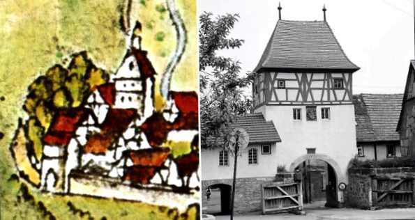 The Kirchheimer gate was therefore already demolished around 1815/16, as can be seen from the Unterpfandsbuch in the city archives of Owen. The comparison of the post-colored picture in Kieser's forest map of 1863 and the picture of the old town gate of Lauda from 1960 gives an idea of how it might have looked like [Landesarchiv Baden-Wuerttemberg, Staatsarchiv Freiburg W 134 Nr. 061404a, excerpt] a rough idea.